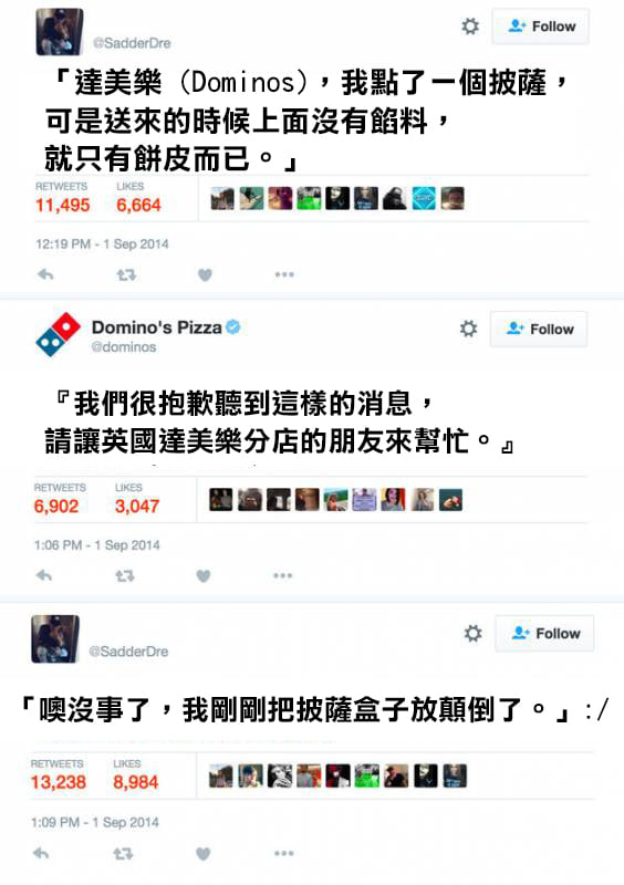 1.「達美樂 (Dominos),我點了一個披薩,可是送來的時候上面沒有餡料,就只有餅皮而已。」 『