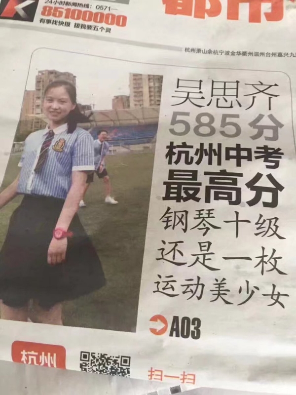 一位中學生妹子,因為成績優異而被媒體採訪,沒想到網友卻發現這照片不尋常! 這妹子就讀杭州的文瀾中學,